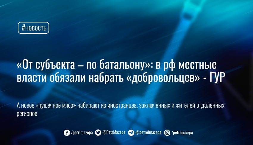 Власти россии, чтобы не прибегать к нежелательной мобилизации, решили обязать каждый регион сформировать по батальону «добровольцев». Набирают людей из мест лишения свободы, жителей дальних регионов и даже иностранцев. Жителей же оккупированных регионов Украины и вовсе заставляют подписывать «контракт» с армией врага.