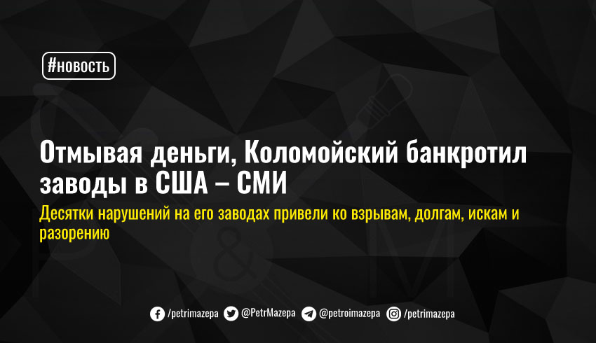 Об этом сообщает Pittsburgh Post-Gazette в своем расследовании «DIRTY DOLLARS». По данным издания, за выведенные из «Приватбанка» средства в США с 2006 по 2016 год Коломойский и его партнеры приобрели 13 сталелитейных заводов. После покупки на заводах Коломойского были зафиксированы многочисленные нарушения техники безопасности, произошло несколько взрывов, пострадали рабочие, был нанесен серьезный ущерб окружающей среде. В 2016 году четыре завода Коломойского объявили о банкротстве из-за долга в 381 млн долларов, еще один завод закрылся. В прошлом году закрыли еще один завод Коломойского.