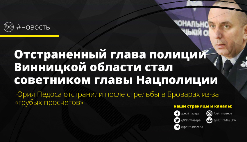 Отстраненный от исполнения должностных обязанностей начальника ГУ Нацполиции в Винницкой области Юрий Педоса назначен советником главы Нацполиции. При его отстранении, после стрельбы в Броварах, пресс-служба МВД сообщала, что причиной решения стали «грубые недостатки и просчеты».
