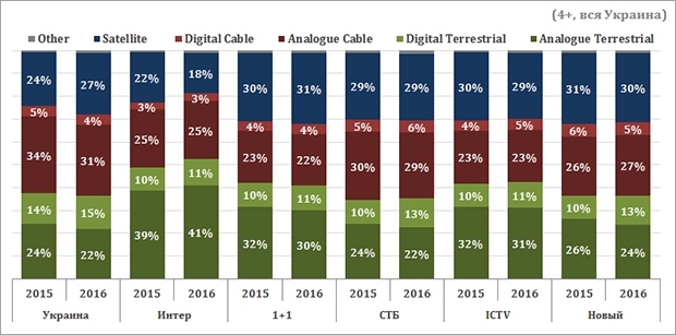 Ну а поскольку средний портрет зрителя «Интера» нам известен, то нет ничего удивительного в том, что канал направлял основные силы на аналоговое вещание. В 2016 году на такой тип приёма приходился 41% всей аудитории «Интера» — больше, чем у любого другого канала в стране.