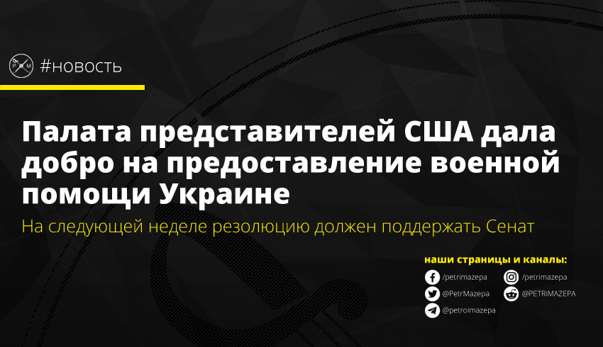 В США нижняя палата Конгресса приняла резолюцию, которая предусматривает предоставление 250 млн долл военной помощи Украине после завершения текущего финансового года в США. Резолюцию еще должен поддержать американский Сенат.
