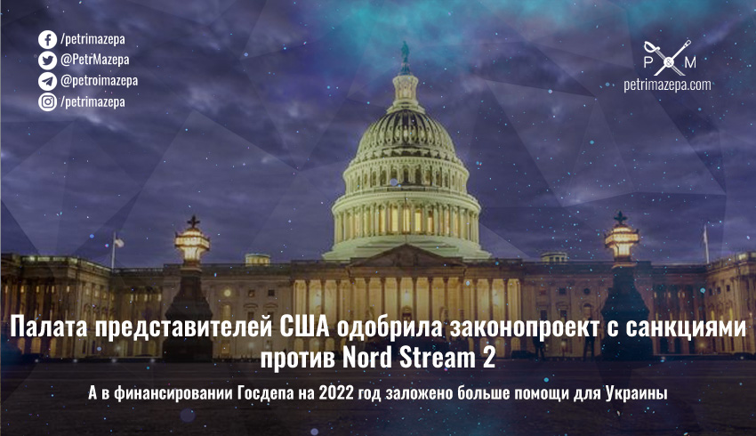 Палата представителей США одобрила законопроект о финансировании Госдепартамента США в 2022 году. В этом документе предусмотрено увеличение размера помощи Украине и есть поправка на санкции против «Северного потока-2».