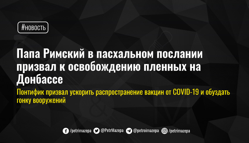 Папа Римский Франциск выпустил свое традиционное Пасхальное послание «Urbi et Orbi» - он призвал к освобождению пленных на востоке Украины и в Нагорном Карабахе, к прекращению гонки вооружений, ускорению распространения вакцин и поддержке беженцев.