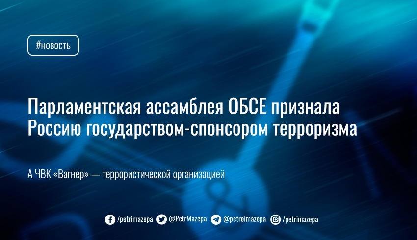 Парламентская ассамблея ОБСЕ сегодня, 4 июля, признала Россию государством-спонсором терроризма, а частную военную компанию «Вагнер» — террористической организацией.