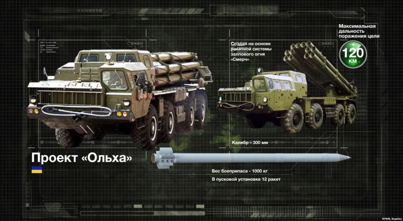 Проект «Вільха» побудований на базі ракетної системи залпового вогню «Смерч». Калібр — 300 міліметрів. Вага боєприпасу — 1000 кілограмів. У пусковій установці —12 ракет. Максимальна дальність ураження цілі — 120 кілометрів. Крім того, траєкторію кожної з ракет можна коригувати вже в повітрі, наводячи на окрему ціль.