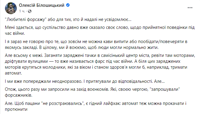Белошицкий заверил, «что общество давно уже сказало свое слово относительно приемлемого поведения во время войны». И никто не мешает людям отдыхать. Но пригонять «заряженные тачки в центр города… — это уже называется фарс во время войны».
