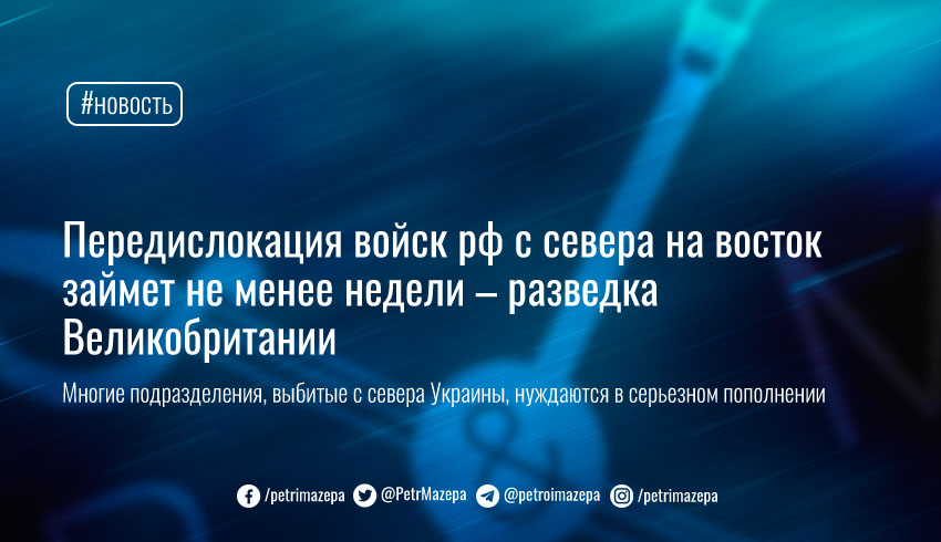 На севере войска рф были выведены в Беларусь, подчеркивается в данных Минобороны Великобритании. Как минимум некоторые из этих сил будут переведены на восток Украины для сражений за Донбасс. При этом передислокация займет как минимум неделю, а многие выведенные подразделения нуждаются в серьезном пополнении личного состава.