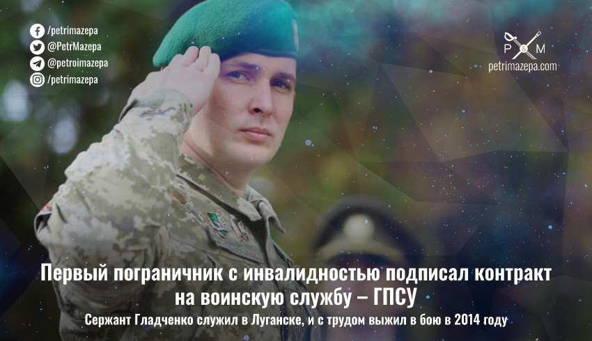 В Государственной пограничной службе заработал на практике механизм принятия на службу лиц, уволенных с воинской службы по состоянию здоровья, заболеваний, ранений, полученных во время исполнения воинских обязанностей. Первым подписавшим контракт пограничником с инвалидностью стал сержант Юрий Гладченко – он уже ранее был пограничником, но был серьезно ранен в 2014 году в Луганске при нападении на пограничников боевиков ОРДЛО.
