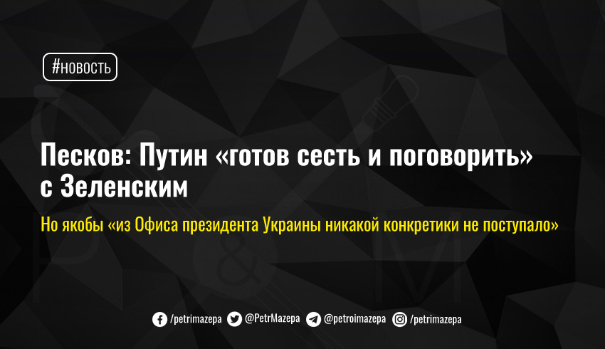 В Кремле заявляют, что у них есть только «первое предложение господина Зеленского президенту Путину поговорить об урегулировании на Донбассе» и «ответ президента Путина, что об этом надо говорить с Донбассом, и приглашение Зеленскому приехать в Москву и поговорить о двусторонних отношениях, если он этого желает».