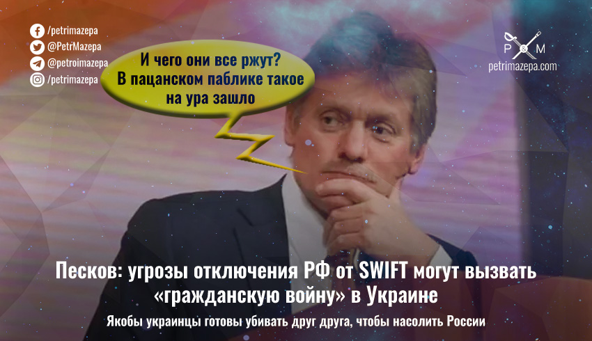 Пресс-секретарь главы страны-агрессора Владимира Путина Дмитрий Песков показал очередной пример извращенной российской логики. Сегодня он заявил, что анонс санкций в виде отключения России от системы международных платежей SWIFT может спровоцировать некие «горячие головы» в Украине на «гражданскую войну», чтобы добиться введения этих санкций.