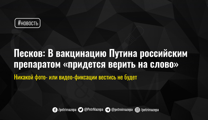 Пресс-секретарь президента РФ Дмитрий Песков заявил, что Владимир Путин и так делает «для пропаганды вакцин очень много», поэтому процесс его вакцинации не покажут. И в то, что главу страны-агрессора укололи именно российским препаратом, «придется верить на слово».