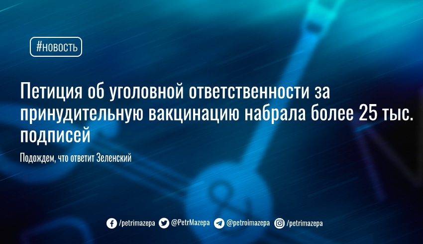 Петиция на сайте президента о введении уголовной ответственности за принудительную вакцинацию набрала более 25 тыс. подписей, необходимых для рассмотрения документа президентом. Автор требует гарантировать гражданам право самим решать, необходимо ли им прививаться.