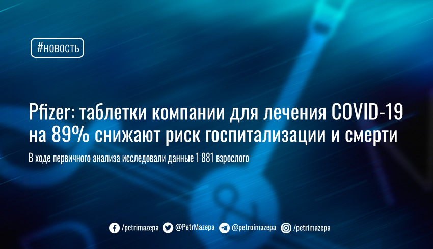 Предварительные результаты промежуточных испытаний показывают, что таблетки Pfizer для лечения COVID-19 снижают риск госпитализации и смерти среди людей из групп риска на 89%.