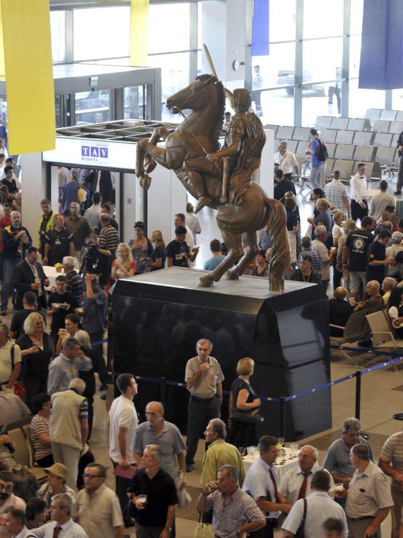 А Македония наоборот — всячески старается ещё больше подружиться с Грецией и на этот раз убрала из аэропорта Скопье (ранее называвшегося в честь Александра Македонского) двухметровую статую, собственно, Александра Македонского. Впрочем, статуя действительно была как-то не оч.