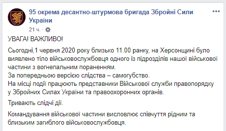 В ВСУ сообщили подробности пропажи военнослужащего 95-й десантно-штурмовой бригады Евгения Добринского на админгранице между АР Крым и Херсонской областью. В пресс-службе командования десантно-штурмовых войск опровергли заявления СМИ об отсутствии у военнослужащего оружия на посту, уточнив также, что на таких объектах дежурят по несколько человек. А сослуживцы пропавшего из 95-й отдельной десантно-штурмовой бригады ВСУ сообщили, что в Херсонской области один из военнослужащих бригады (не тот, что пропал) был найден мёртвым, предварительно — из-за самоубийства.