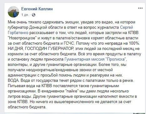 Видимо, у власти мало проблем с перемирием, и потому в Донецкой области решили ещё и поругаться с волонтёрами. Глава Донецкой ОВГА Павел Кириленко уверяет, что водой, провизией и палатками застрявших на КПВВ обеспечивает власть, а не благотворительные фонды и волонтёры. Что вызвало резкий ответ Евгения Каплина, руководителя гуманитарной миссии «Пролиска».
