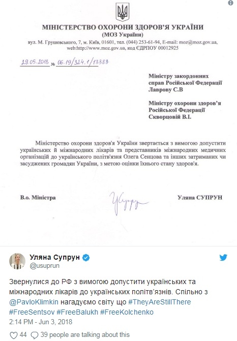 Ситуация с украинскими заложниками, незаконно удерживаемыми в тюрьмах России, остаётся напряжённой. Несмотря на многочисленные заявления со всего мира от разных структур, селебрити и официальных лиц, пленники Кремля остаются не просто в тюрьмах, а и без надлежащего медицинского сопровождения. Голодающие Олег Сенцов, Александр Кольченко, Игорь Балух настаивают на своём праве распорядиться последним, что у них осталось, — их жизнью — по своему усмотрению. И.о. министра здравоохранения Ульяна Супрун направила главе МИД РФ письмо с требованием пустить к политзаключённым украинских и международных врачей, но реакции, понятное дело, не последовало.