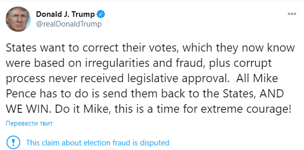 В США планировали провести совместное заседание Конгресса, на котором должны были утвердить результаты голосования выборщиков. Обычно церемониальная процедура в этот раз превратилась в повод для беспорядков. С самого утра в Вашингтоне собирались сторонники Дональда Трампа, а сам пока ещё действующий президент давал через Twitter ценные советы Майклу Пенсу, как тому стоит вести себя в Конгрессе, чтобы обеспечить победу Трампу справедливый учёт голосов.