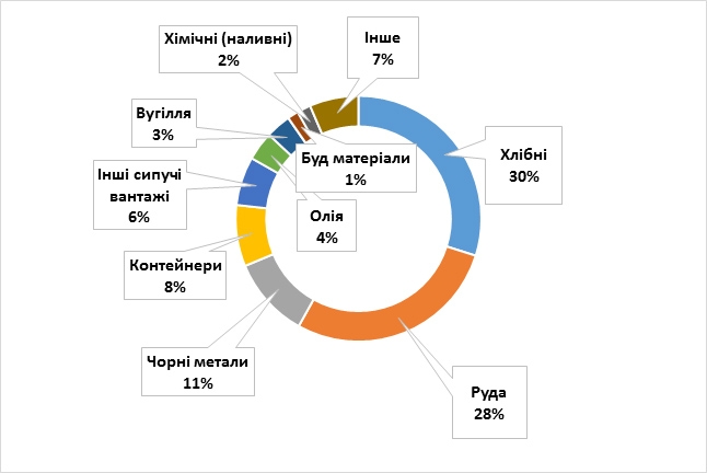 С января по октябрь наши порты обработали 132,05 млн тонн груза. Перевалка экспортных грузов выросла на 3,8% и составила 101,36 млн тонн. Каботажных — до 2,07 млн тонн (рост на 23,3%). А вот импорт и транзит просели: -5,8% и -6,9% соответственно. Ниже — диаграмма типов обработанных грузов.
