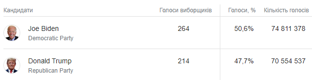 Исход выборов в США до сих пор неясен. Пока голоса распределены следующим образом: Дональд Трамп — 214, Джо Байден — 264. В обращении Джо Байден заявил, что выигрывает Неваду и Аризону, но ещё не готов объявить о полной победе. Он также добавил, что получит более 300 голосов выборщиков, в то время как для победы необходимы 270 голосов.