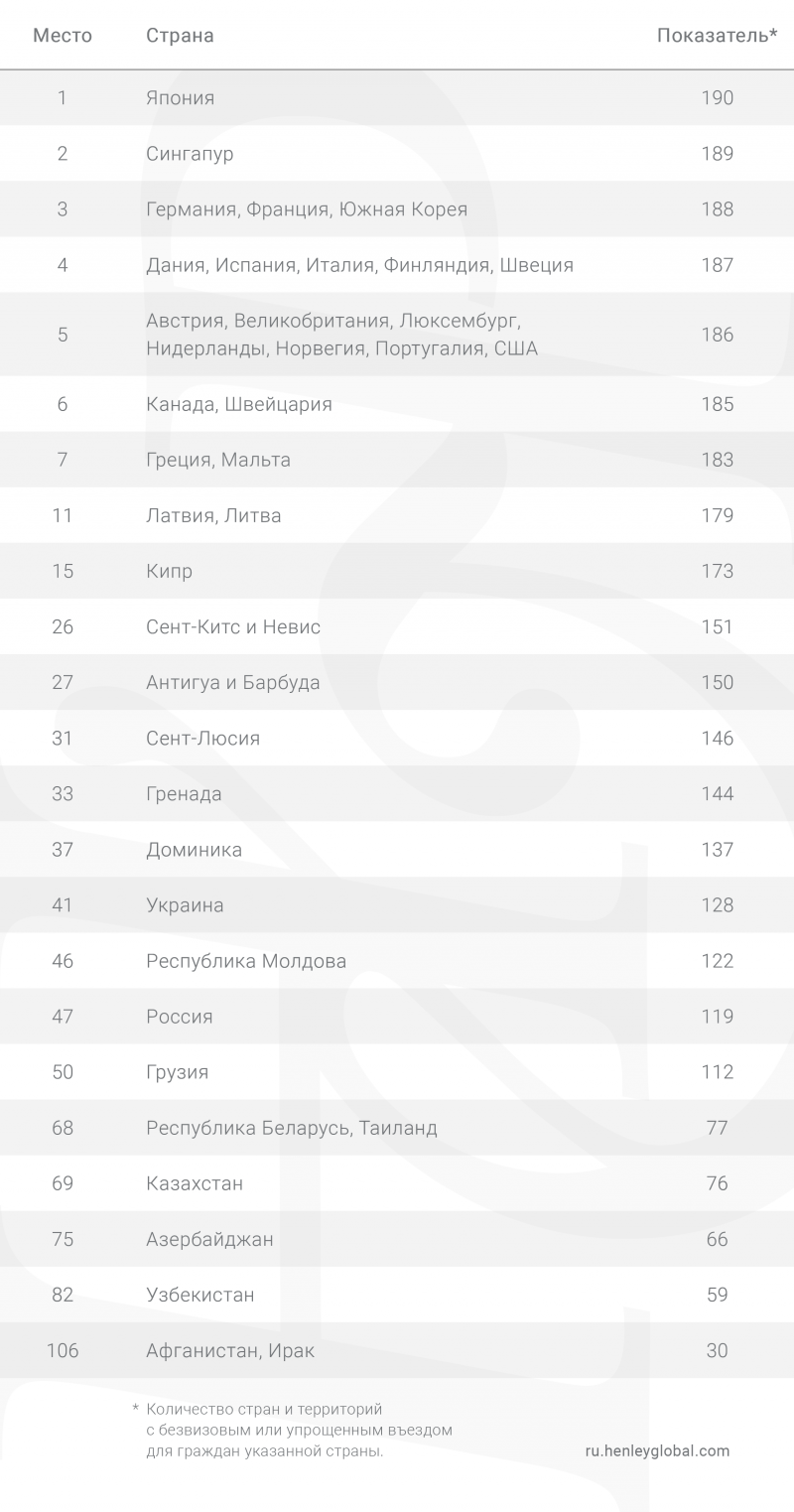 Український паспорт опинився на 41-му місці у світі за рівнем «мобільності», про що свідчать дані оновленого рейтингу-індексі паспортів Henley & Partners. Наразі дані Індексу показали, що найбільш «мобільним» є паспорт Японії, громадяни якої можуть відвідувати без візи 190 країн світу. Раніше тут була майже беззмінним лідером Німеччина (188 країн), зараз вона третя.