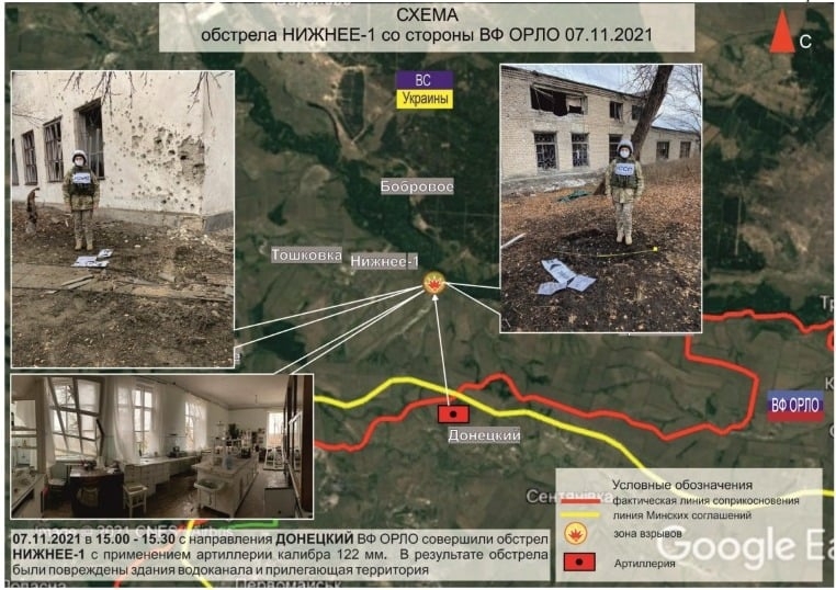 Немного ранее, 7 ноября, оккупанты обстреляли из 122-мм артиллерии Светличное, где пострадало здание водоканала, снабжающего водой в том числе и жителей оккупированных территорий. Всего было зафиксировано 6 попаданий снарядов калибра 122 мм, серьёзно повреждено здание и техника водоканала, разрушено помещение и уничтожено оборудование химико-биологической лаборатории. Последствия обстрела показала украинская делегация в ТКГ.