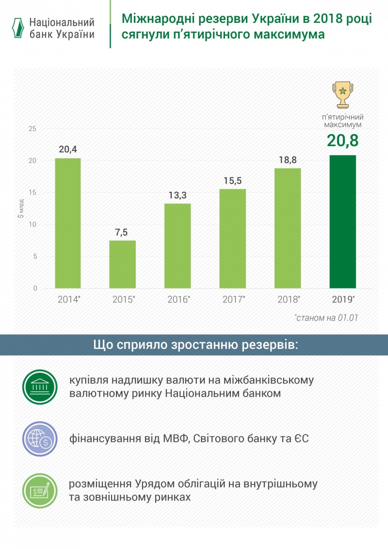 По итогам 2018 года международные резервы Украины выросли на 10,6% и на 1 января 2019 года составили 20,8 млрд долларов, о чём свидетельствуют предварительные данные НБУ. Такой объём резервов не только превысил последний прогноз Нацбанка, но и достиг 5-летнего максимума — последний раз такой уровень резервов был зафиксирован ещё в октябре 2013 года. «Увеличить международные резервы удалось, прежде всего, благодаря получению Украиной внешнего финансирования и покупке Нацбанком избытка валюты на межбанковском рынке», — поясняют в пресс-службе.