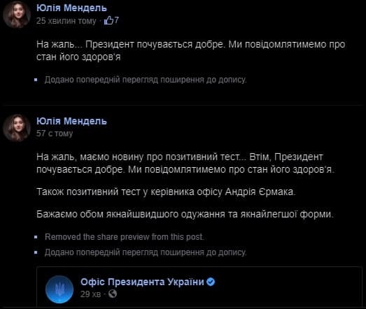 Вчера COVID-19 заболели президент Владимир Зеленский, глава Офиса президента Андрей Ермак, министр обороны Андрей Таран, а также, по заверениям Ирины Верещук, министр финансов Андрей Марченко, и действующий городской голова Николаева Александр Сенкевич. Президент к вечеру, после реакций на странный пост его пресс-секретаря Юлии Мендель, обвинил своих оппонентов в том, что они радуются его болезни, что с его точки зрения означает «ампутированную совесть» и «полное отсутствие человечности». В ответ на что ему в сети припомнили шутки про «эбонитовые палочки», «медленно сдвигают границу», «актрису из немецких фильмов» и «горіла хата, палала».