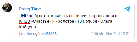 С утра 10 ноября штаб ООС возобновил работу всех КПВВ на Донбассе. Открыты КПВВ «Гнутово», «Новотроицкое», «Марьинка», «Майорское» в Донецкой области, а в Луганской — КПВВ «Станица Луганская» и два новых пунктах пропуска «Счастье» и «Золотое». Но террористы «ДНР» и «ЛНР» вскоре ответили, что не будут открывать пункты пропуска со своей стороны.