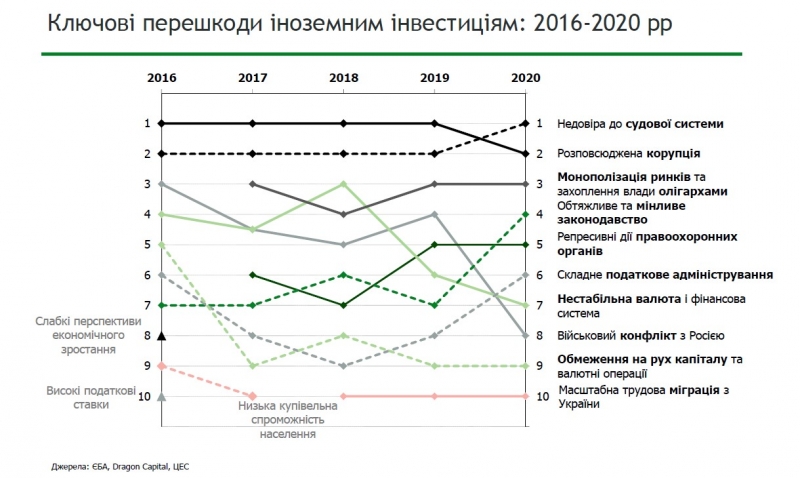 Впервые за пять лет опроса иностранных инвесторов, который ежегодно проводят Европейская Бизнес Ассоциация (ЕБА), DragonCapital и Центр экономической стратегии (ЦЭС), недоверие к судебной системе стало основным в антирейтинге препятствий для иностранных инвестиций. Коррупция, которая была лидером предыдущих лет, заняла только второе место. Эти два препятствия являются важнейшими как для стратегических, так и портфельных инвесторов.