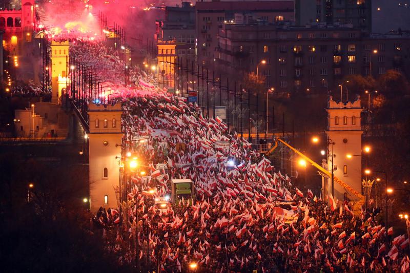 В Варшаве прошёл большой марш националистов. Также среди организаторов были католические организации. По данным польских СМИ, за нарушение порядка 45 человек были задержаны. Но задержания происходили на акции на улице Смольной, где проходила контрдемонстрация. По мнению министра внутренних дел и администрации Польши Мариуша Блащака, марш прошёл в спокойной атмосфере. «Это доказательство, что Польша является свободной и демократической страной», — заявил министр. По оценкам полиции, всего было 308 собраний во всей Польше, и в них приняли участие более 65 тысяч человек. В Варшаве параллельно с маршем независимости также прошли акции анархистов и феминисток.