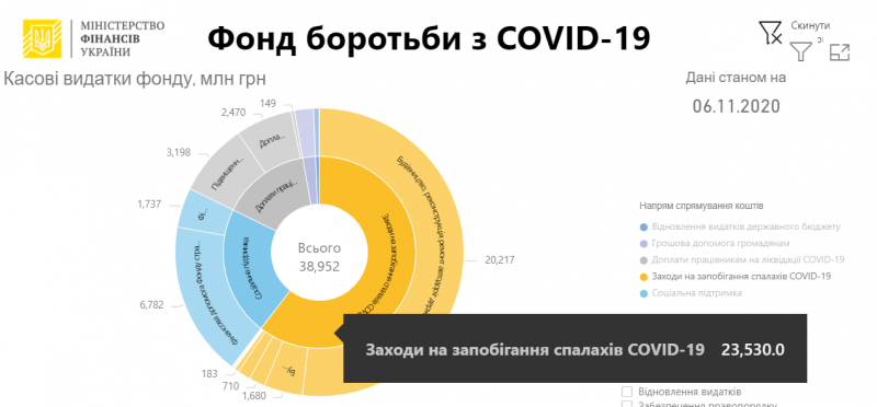 В Минфине и Кабмине же отчитались, что из фонда борьбы с COVID-19 потрачено уже 59% средств — на официальном сайте Кабмина красиво рассказывают о суммах, потраченных на здравоохранение (6,6 млрд грн из 39 млрд грн), однако на официальном сайте Минфина можно оценить, что на «мероприятия, направленные на предотвращение вспышек COVID-19» потрачено 23,53 млрд грн. Из этой суммы на строительство дорог ушло 20,2 млрд грн. Как дороги могут помешать возникновению вспышек COVID-19 — известно только Минфину.