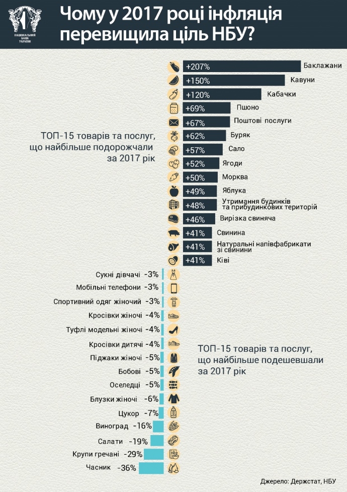 По данным Госслужбы статистики, в 2017 году потребительская инфляция в Украине составила 13,7% и превысила цель (8% +-2 п.п.) Национального банка, сообщает пресс-служба НБУ. Базовая инфляция по итогам 2017 года ускорилась до 9,5% по сравнению с 5,8% в 2016 году. Наиболее существенно на уровень инфляции повлияло подорожание услуг заведений быстрого питания, высшего образования, содержание придомовых территорий, сообщает НБУ.