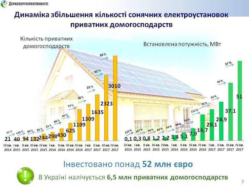 ЕБРР выделил Украине 25,9 млн евро на строительство трёх новых солнечных электростанций. «Этот проект — ещё один шаг к энергонезависимости нашего государства. А также новые рабочие места для 350 человек, которые будут заняты на строительстве, и ещё 15-ти, занятых на обслуживании станции», — рассказал Президент Пётр Порошенко на своей странице в Facebook, отметив, что станции будут строиться в Винницкой области. Стоит отметить, что по сравнению с 2014 годом в Украине значительно увеличилось количество солнечных электроустановок в частных домохозяйствах. Динамику их роста привело Госагентство по энергоэффективности и энергосбережению в инфографике.