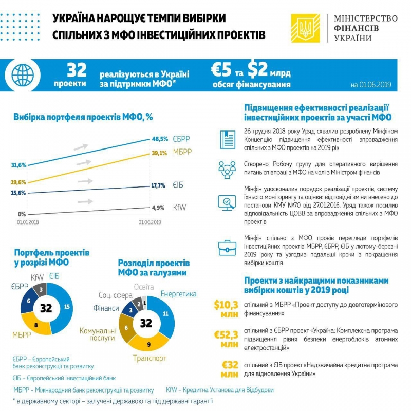 По состоянию на 1 июня 2019 года использование средств международных финансовых организаций Украины выросло на 286,86 млн долл. и 141,15 млн евро по сравнению с аналогичной датой прошлого года, сообщает пресс-служба Министерства финансов. «Таких успехов мы не имели с 2013 года: выборка по проектам Всемирного банка достигла почти 40%, а ЕБРР — почти 50%», — подчеркнули в Минфине. На сегодня показатель выборки по займам Всемирного банка составлял 39,1%, тогда как за все предыдущие годы сотрудничества Украины с Банком рекордным показателем выборки было 30,2% в 2013 году, отметили в Минфине.