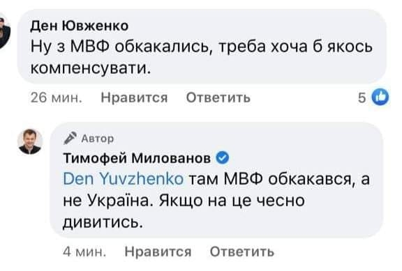 Зато порадовался Тимофей Милованов, вынесший самому себе диагноз ещё в 2019 году. По словам бывшего министра экономики и нынешнего помогатора главы ОПУ, ситуация с МВФ под контролем — зато «каждый отстаивает свою позицию». Спасибо, Тимофей. Надеемся, это когда-нибудь научат конвертировать в деньги. Если коротко, то МВФ не видит достаточного количества позитивных изменений в стране в последнее время.