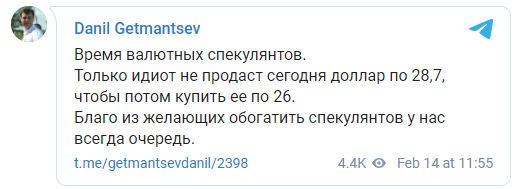 Курс доллара вырос до 28,51 грн на продаже, при покупке — до 28,49 грн. Официальный курс Нацбанком установлен на уровне 28,53 грн за доллар. Плюс 50 копеек на ровном месте. Правда, есть один финансовый гуру, зовут его Даниил Гетманцев — в этот раз он обвинил во всём валютных спекулянтов и заявил, что «только идиот не продаст сегодня доллар по 28,7, чтобы потом выкупить по 26». Запомните этот твит. Гении у нас в налоговом комитете сидят, не иначе.