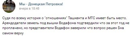 Среди немногих развлечений на неподконтрольной территории сейчас наиболее актуальна игра в детектива. Многие пытаются понять, каким образом «Водафон» умудрился три года, не имея доступа к вышкам, осуществлять поддержку работы сети. Нашлось в ней место и откатам для Ташкента (глава возрождённого «минсдоха» и «сухопутный адмирал» всея дыры).