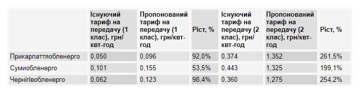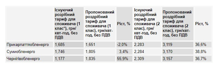 Согласно расчётам компаний («Прикарпатьеобленерго», «Сумыобленерго», «Черниговобленерго») следующие изменения приведут к росту розничных тарифов для конечных потребителей 2 класса на треть, а на Черниговщине тариф вырастет в полтора раза и для 1 класса потребителей.