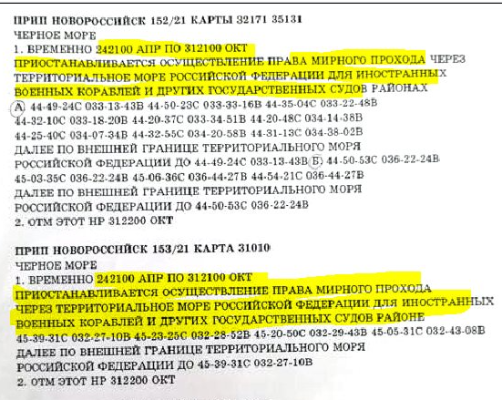 Также стало известно о планах РФ в нарушение всех договоров и международных норм с 24 апреля по 31 октября 2021 года незаконно ограничить движение судов через Керченский пролив под видом учений. Опубликованный запрет касается «иностранных военных кораблей и государственных судов (то есть не касается коммерческого судоходства)».