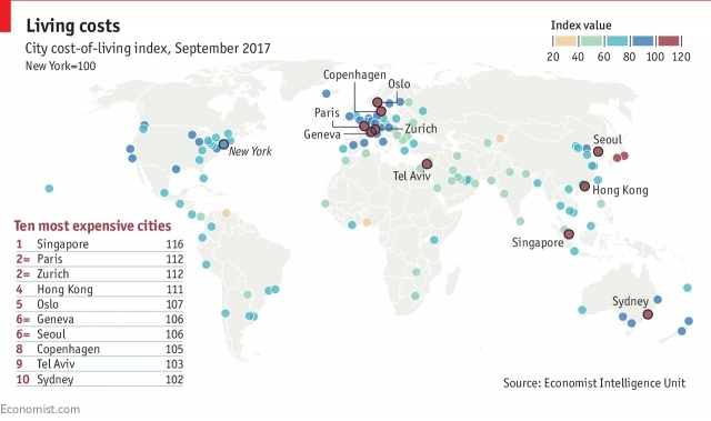 Киев поднялся на 20 позиций в списке наиболее дорогих городов мира и занял 110-е место в рейтинге, о чём свидетельствуют данные рейтинга Worldwide Cost of Living 2018, которое готовит издание The Economist. Если в прошлом году Киев был на 3-м месте самых дешёвых городов мира, то нынче он оказался на 23-й позиции. Среди самых дешёвых городов планеты в марте 2018 года издание выделило Дамаск (Сирия), Каракас (Венесуэла), Алматы (Казахстан) и Бухарест (Румыния).