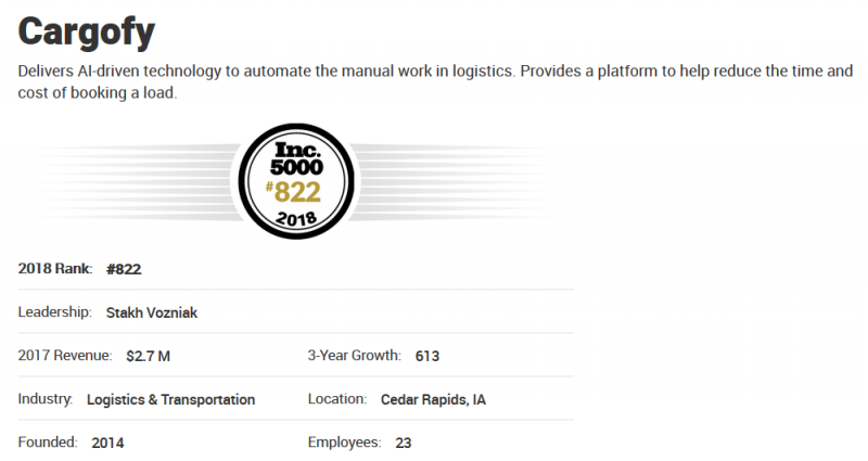 Стартап Cargofy потрапив до щорічного рейтингу «5000 найбільш швидкозростаючих компаній США». Українська платформа для вантажоперевезень Cargofy зайняла 822 сходинку рейтингу та увійшла в число 1000 компаній які найшвидше зростають у США. У 2017 році доходи компанії склали 2,7 млн доларів. У США стартап переїхав в минулому році, щоб проходити акселерацію в Iowa Startup Accelerator. «Місяцем раніше нас вибрали як один з 5-и кращих стартапів в сфері Mobility для виступу на самому значущу подію в технічному світі Techcrunch Disrupt. Про що пару років тому я міг тільки мріяти, коли дивився серіал «Кремнієва долина». Нас запрошують податися на програму імениті акселератори, такі як 500 Startups і Techstars. І зараз головне правильно скористатися цими можливостями», – ділиться враженнями засновник стартапу Стас Возняк. Cargofy має чотири компанії: в Калинівці і Києві (Україна), Гургаоне (Індія) і Сідар-Репідс (США). У команді працює 23 співробітники, не рахуючи зовнішніх контракторів, парт-тайм співробітників і аутсорсингового колл-центру в Філіппінах.