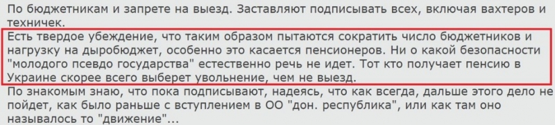 В Донецке подписываться под документом о том, что ты становишься невыездным, приходится уже не только типичным «госслужащим», но и всем бюджетникам — врачам, учителям, техперсоналу бюджетных организаций и, по слухам, даже шахтёрам. По одному из мнений, таким образом недореспублика с курмаршалом во главе пытается экономить средства.
