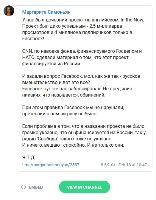 А тепер вдягаємо сварочні окуляри – йдемо милуватися заревом зі сходу. Компанія Facebook заблокувала сторінку англомовного відеопроекту Russia Today «In the Now», після розслідування CNN. Негарна карлікеса Маргарита Симоньян верещить, що «проект був дико успішним - 2,5 мільярда переглядів і 4 мільйони підписників тільки в Facebook». Яка.сумна.новина.джпипег, ага.