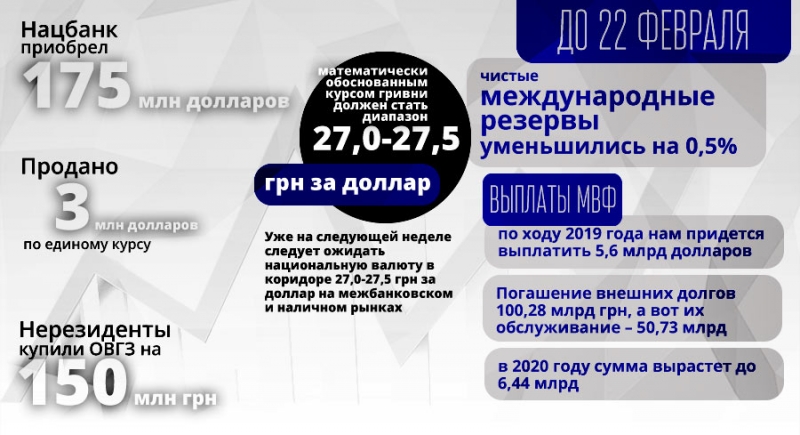 Население продало наличной валюты на 175,5 млн долларов больше, чем приобрело. Нацбанк активно скупал валюту с 4 по 8 февраля. Всего в это время регулятор приобрел 175 млн долларов. Через механизм Matching, в частности, пришло 75 млн, ещё 100 млн были куплены по единому курсу. Точно так же (по единому курсу) и была продана валюта (3 млн). Здесь всё хорошо, но теперь плавно переходим к более серьёзной теме — внешним долгам.