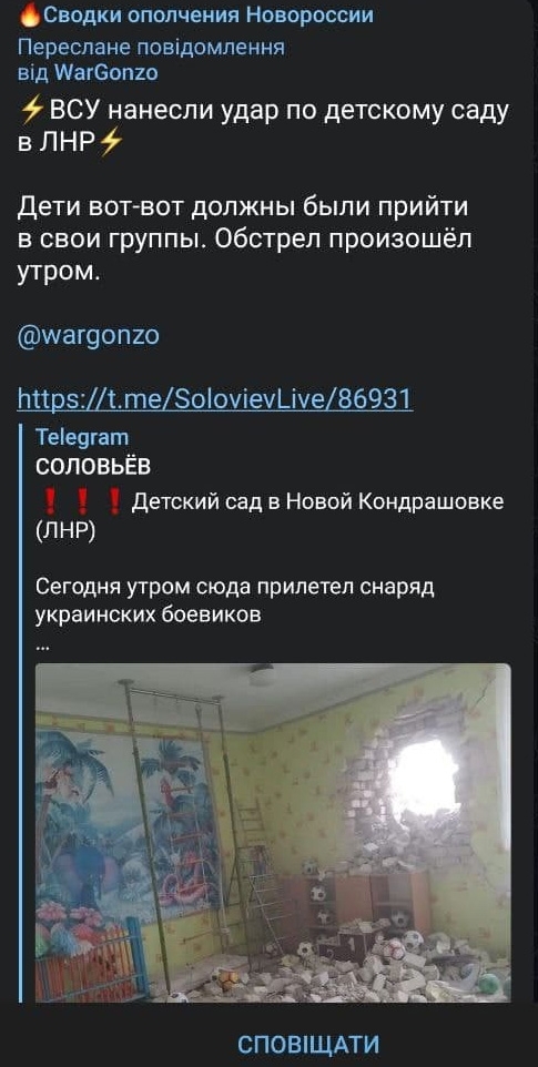 Российские пропагандисты, включая «звёзд первой величины» типа Соловьева, пытались выдавать последствия обстрелов российско-оккупационных войск за действия украинской армии. Но, будучи быстро разоблачены, подтирали свои посты. Остались лишь скрины.