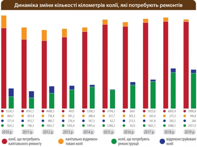Длина железнодорожного полотна, которое остаётся без надлежащего технического обслуживания путей, ежегодно растёт, пишет медиацентр УЗ «Магистраль». Железнодорожная инфраструктура Украины из-за нехватки средств постепенно теряет свою мощность, отмечается в материале. По данным Департамента путей и сооружений компании по состоянию на 1 января текущего года развёрнутая длина главных путей составляет более 27 тыс. км. На начало нынешнего года протяжённость путей с просроченными сроками реконструкции составила 2431,9 км. Усиленного капитального ремонта ожидают 1255,3 км путей, а капитального — 4735,5 км. Между тем на железной дороге эксплуатировалось почти 122 тыс. дефектных рельсов и более 25 тыс. мест временного восстановления рельсовых плетей бесстыкового пути.