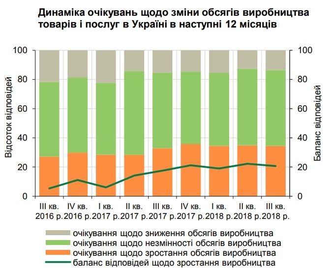 Представители бизнеса ожидают, что среднее значение обменного курса через 12 месяцев составит 29,6 грн за доллар. Об этом свидетельствуют результаты ежеквартального опроса руководителей предприятий, проведённого НБУ в третьем квартале 2018 года. 58,5% респондентов ожидает, что инфляция не превысит 10% или будет снижаться. Респонденты продолжают ожидать роста объёмов производства товаров и услуг, хотя эти ожидания немного снизились — 20,7% против 22,2% во II квартале 2018 года.