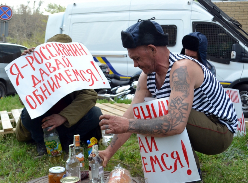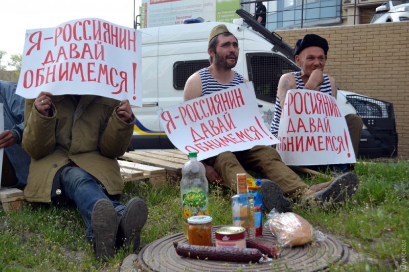 Активисты из «Рады громадськой безпеки» привели под Генконсульство РФ в Одессе бездомных, переодетых в ватники, которые держали плакаты «Я —россиянин, давай обнимемся».