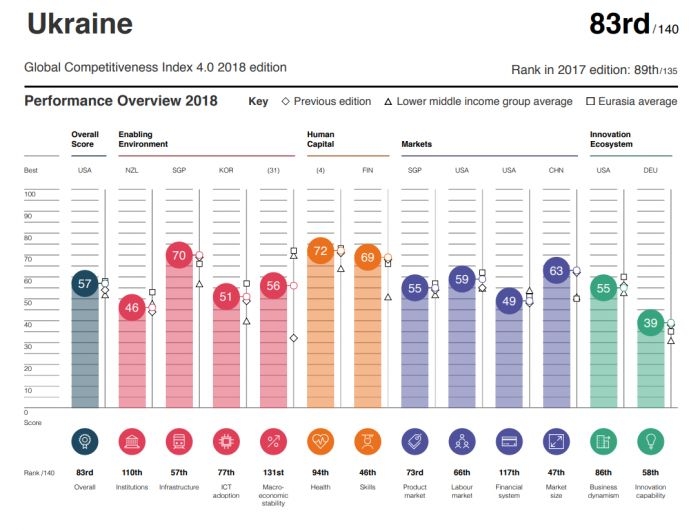 Україна зайняла 57-е місце в рейтингу країн за показником розвитку інфраструктури, який підготувала організація «Всесвітній економічний форум» (ВЕФ). Дослідження присвячене вивченню конкурентоспроможності країн і «інфраструктура» там один з блоків поряд з «розвитком інститутів», «інноваціями» тощо. Показник інфраструктурного розвитку України став одним з найкращих в порівнянні з іншими компонентами рейтингу конкурентоспроможності. Краща ситуація тільки в напрямку «вміння» (46-е місце) і «розмір ринку» (47-е місце). За показником «інновації» Україна розташувалася на 58-му місці.